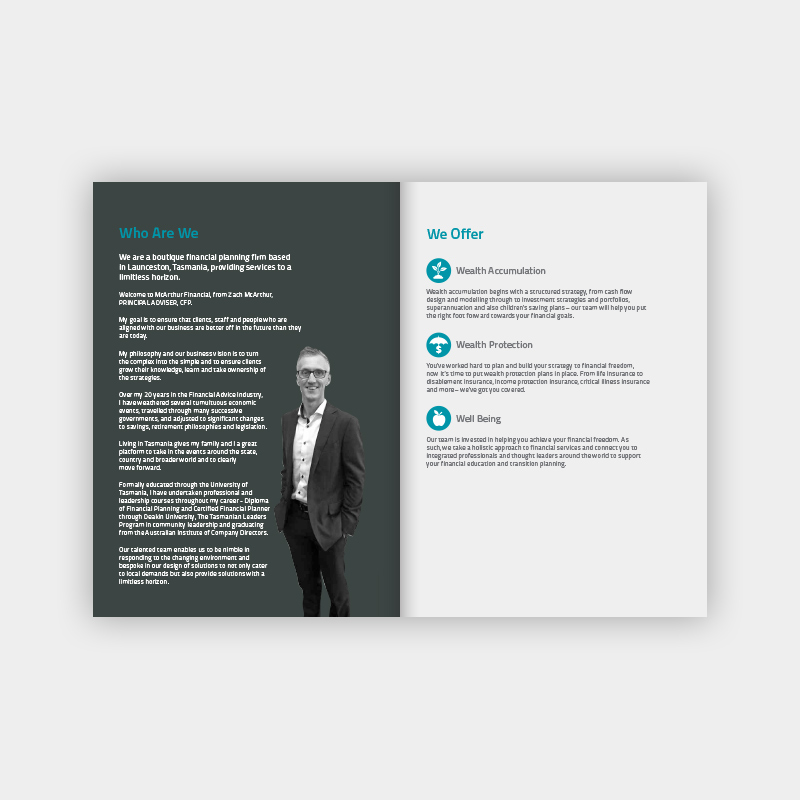 Tasked with branding a new boutique financial planning firm in Launceston, zest worked on a full branding package for the team - logo design, website design and print design. We delivered a trendy brand image and website with some neat features, all showcasing the colour scheme of black, white and pop of their signature colour.
